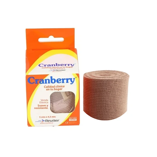 Venda elástica beige de 5 cm x 4,5 m de la marca Cranberry , ideal para inmovilización y compresión en lesiones traumatológicas. Flexible, reutilizable y libre de látex.